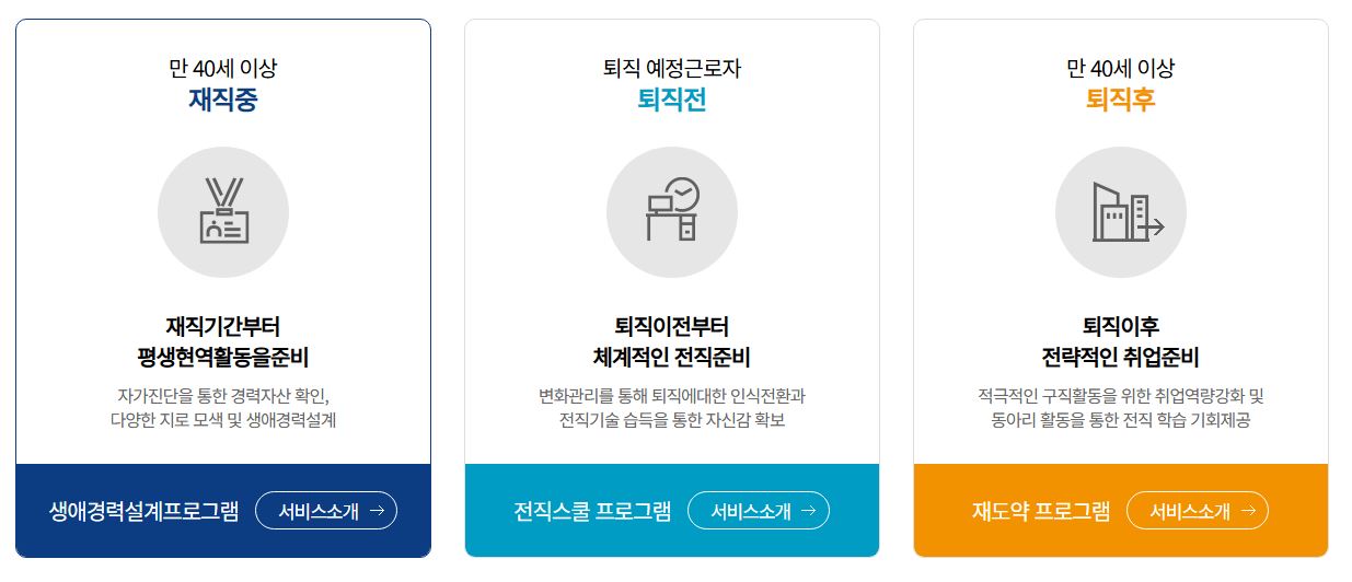 중장년 평생현역 프로젝트. 중장년내일센터의 생애경력설계, 전직지원 프로그램을 언제 어디서나 온라인 학습을 통해 체계적으로 준비할 수 있습니다