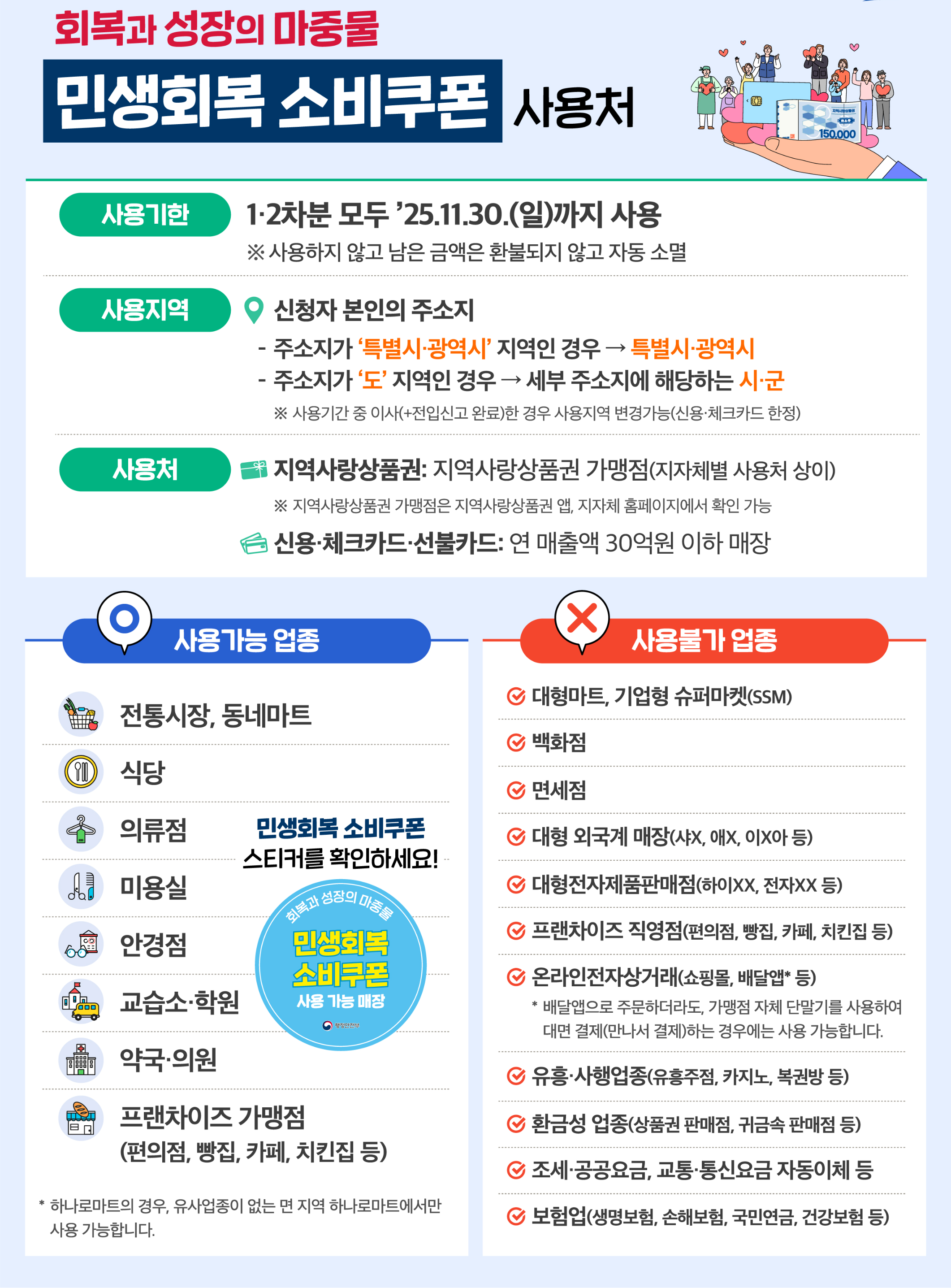 또한 생활협동조합과 군 장병 인근 상권 등 실생활에서 활용할 수 있는 공간이 새롭게 포함되며, 소비쿠폰의 실질적 효과를 높이려는 정책적 의도가 담겼습니다. 이번 조치는 단순한 현금 지원이 아니라 국민 생활 안정과 지역경제 회복이라는 두 가지 목적을 동시에 달성하려는 시도입니다.