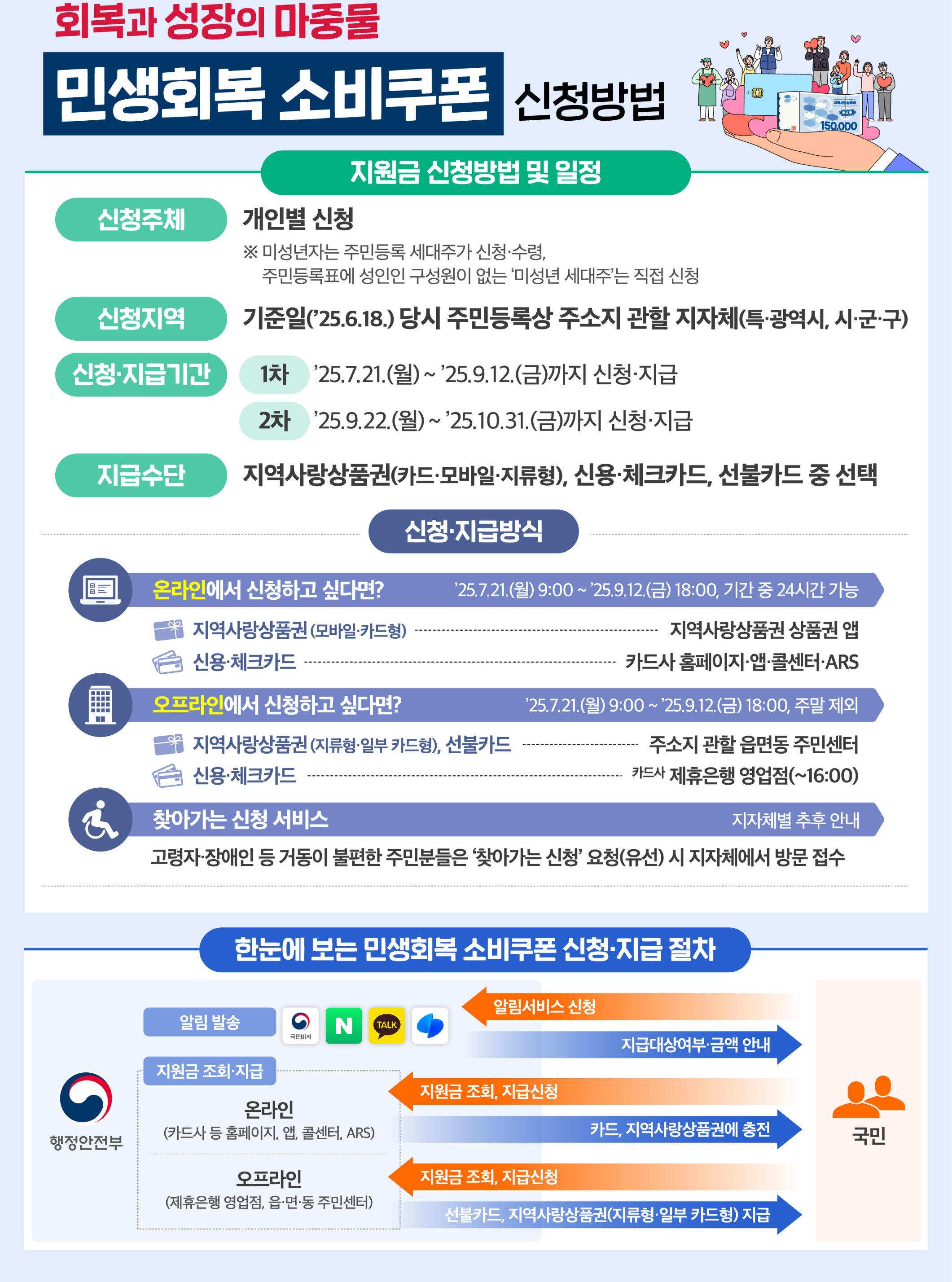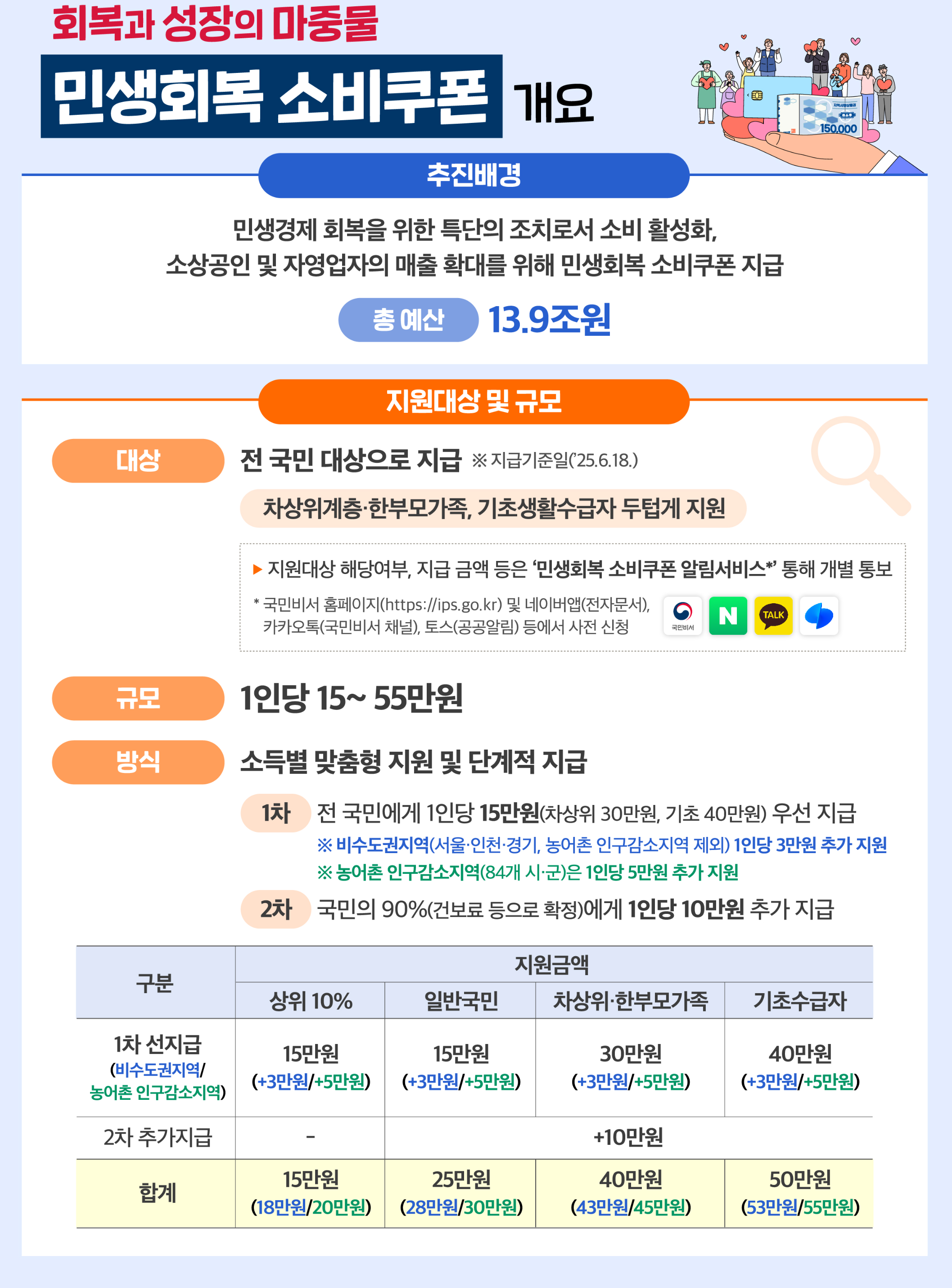 지난해 지급된 1차 민생회복 소비쿠폰은 전 국민을 대상으로 했다는 점에서 차이가 있습니다. 당시에는 1인당 15만 원이 지급되었으며, 차상위 가구와 한부모가족은 30만 원, 기초생활수급자는 40만 원을 지원받았습니다. 또한 지역별로 차등 지원이 적용되어 비수도권 주민은 3만 원, 농어촌 인구 감소 지역 거주자는 5만 원을 추가로 받을 수 있었습니다.