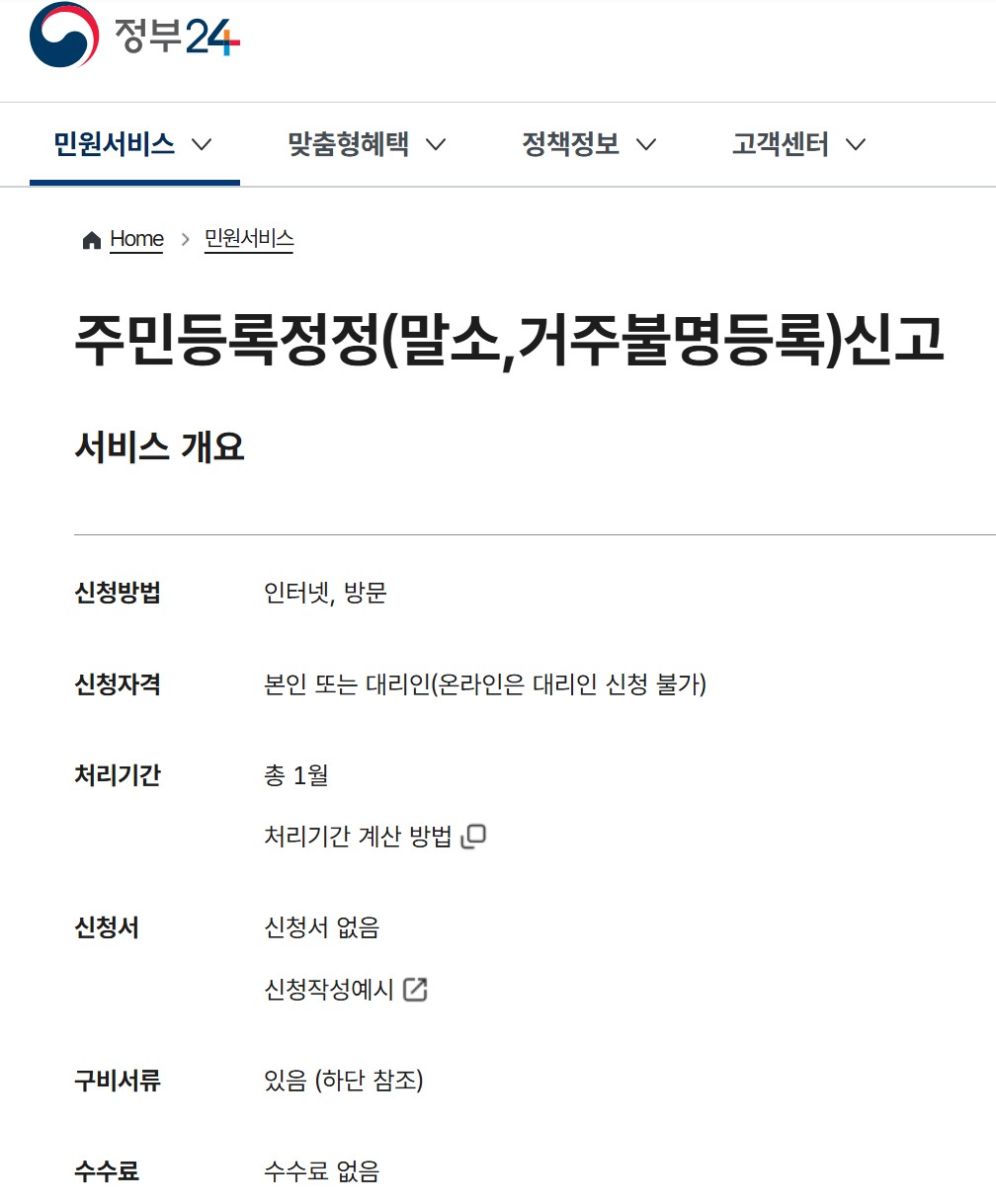 - 주민등록정정(말소) 신고서(주민센터 비치)