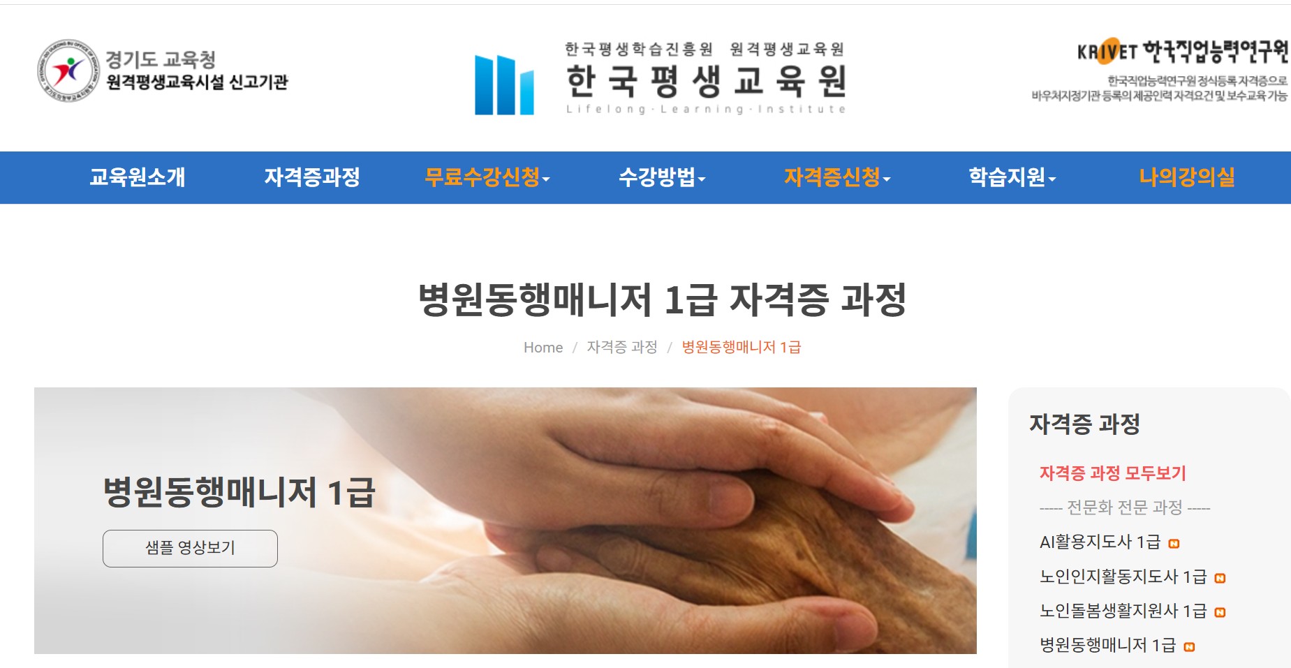 한국직업능력진흥원은 '병원동행매니저 1급' 과정을 운영하며, 온라인 강의와 시험을 원스톱으로 제공하고 있어 많은 수강생이 선호합니다.