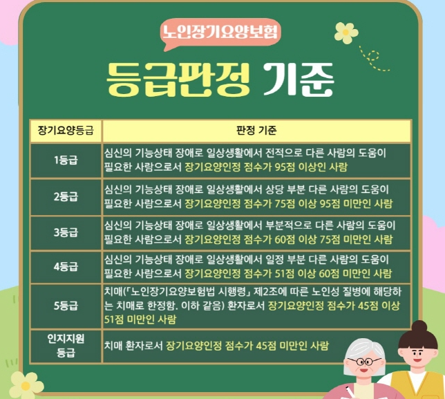 1~5등급, 그리고 인지지원등급을 받은 어르신은 장기요양보장의 혜택을 받을 수 있어 비용 부담이 줄어듭니다.