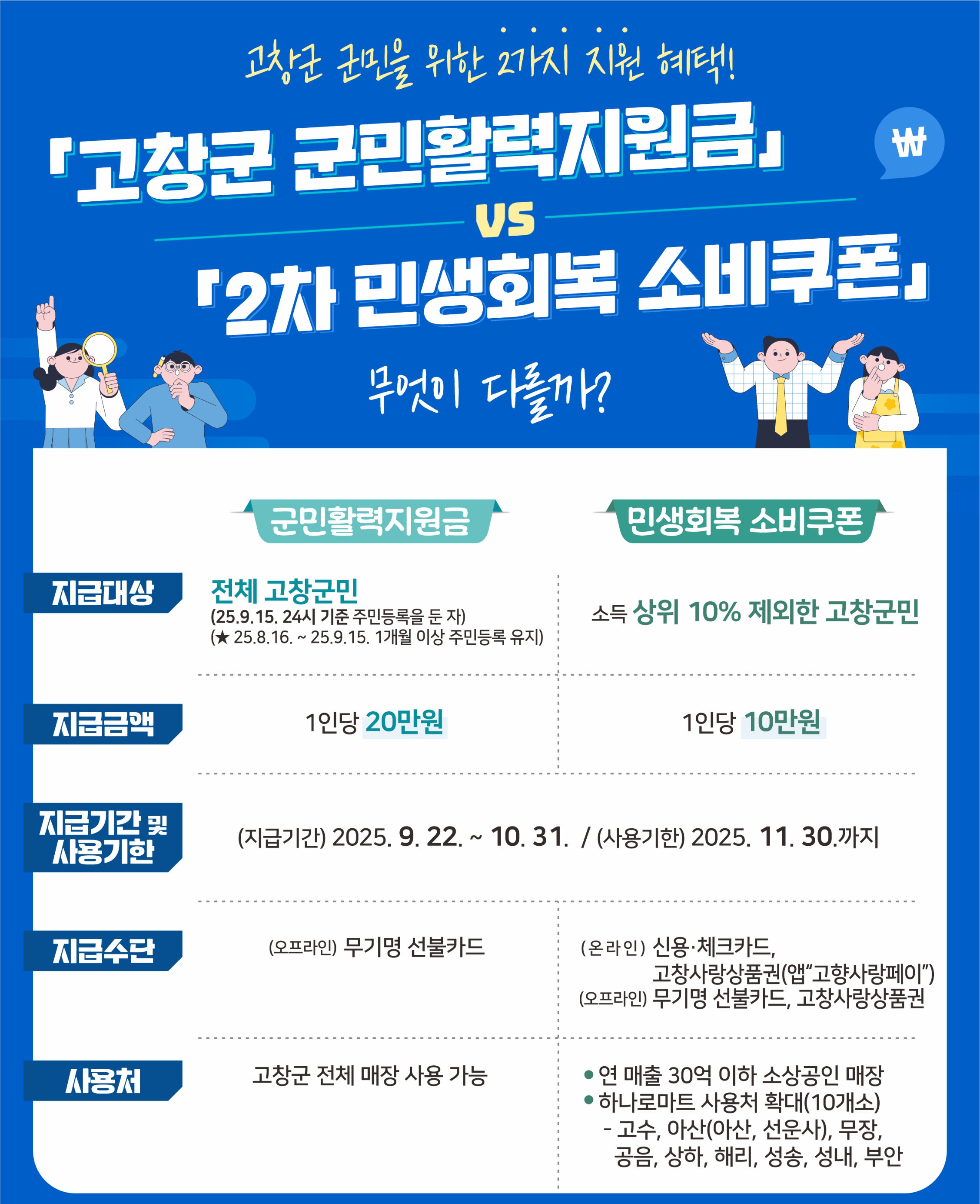 이러한 상황에서 고창군은 군민들의 생활 안정과 지역 경제 회복을 위해 군민활력지원금과 민생회복 소비쿠폰을 동시에 지급하기로 결정했습니다.